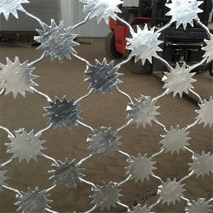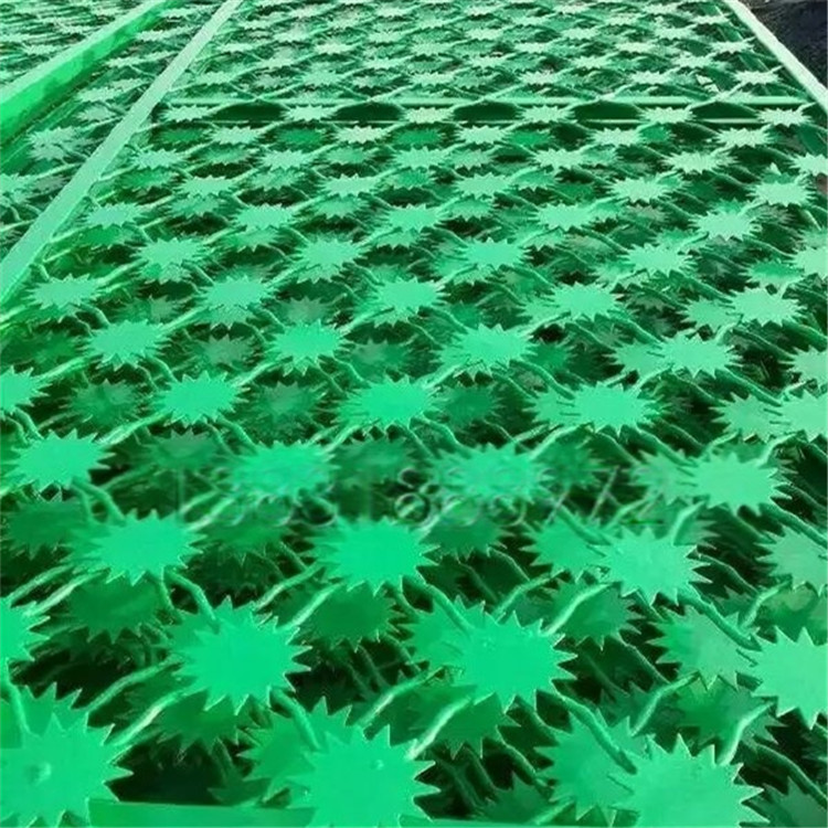 1、梅花刺隔離網(wǎng)為單層梅花刺片網(wǎng),直徑不小于7.5cm,刺片厚1.5mm,采用Q235低碳鋼板沖壓成型。
