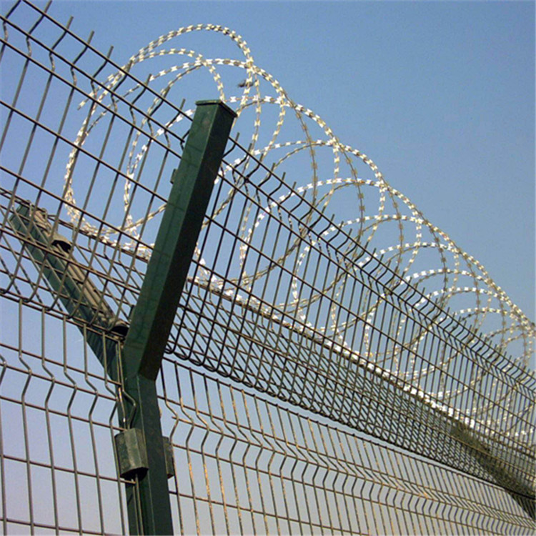 監獄鋼網墻采用高強度的刀片刺網與普通防護網的結合,由V型支架立拄,加強型焊接片網,安全防盜連接件和組成。監獄護欄網網格結構簡練、便于運輸、安裝不受地形起伏限制,特別是對于山地、坡地、多彎地帶適應性極強。螺旋型交叉刀片刺網是在兩條刀片刺網之間以不銹鋼片和鍍鋅鋼片強力夾扣,展開后即呈交叉狀,美觀又實用。
