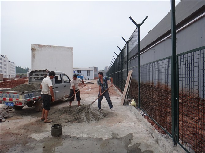 4、隔離柵的立柱的埋設應分段進行, 先埋兩頭的立柱,然后拉線埋設中心的立柱。