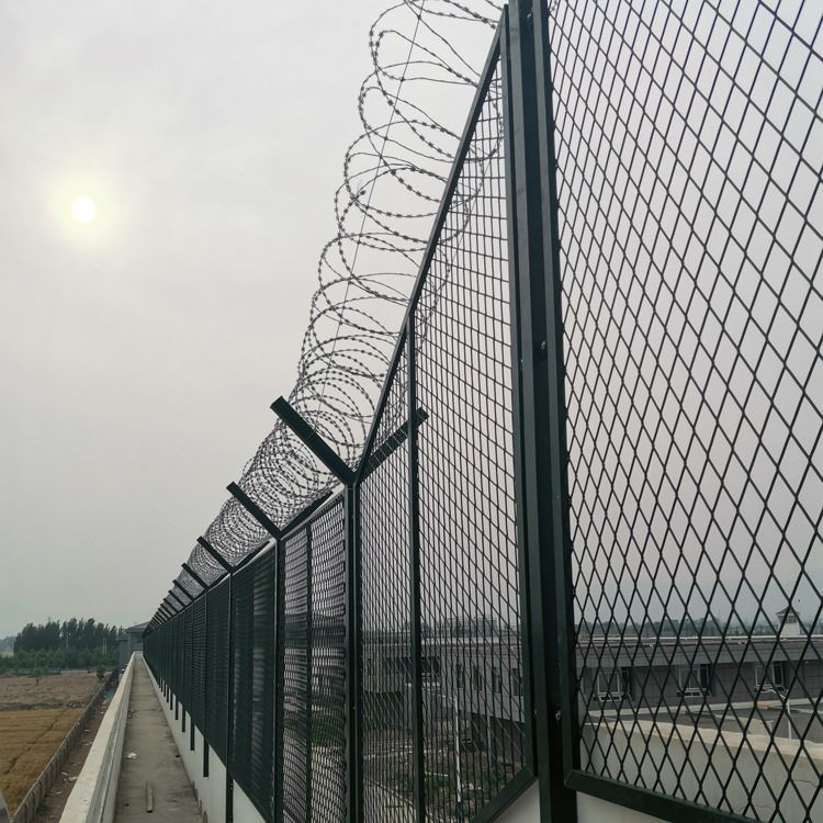 監獄巡邏道鋼網墻V型頂端安裝刀片剌網, 直徑采用50cm-60cm刀片剌網主要是由熱鍍鋅鋼板或不銹鋼薄板沖壓而成的,它擁有尖銳的刀片,張力鍍鋅鋼絲或者不銹鋼絲做芯線組合而成的產品。使得犯人無力翻越監獄巡邏道鋼網墻。我們艾瑞金屬擁有豐富的產品生產及設計經驗,為許多的監獄和看守所生產過產品,我們從2012年開始就做了全國很多家監獄的成功案例和機場的建設參與,我們的產品贏得了廣大新老客戶的一致好評,所以在監獄鋼網墻生產和安裝方面有豐富的經驗和案例,有這方面的咨詢,歡迎來廠、來電咨詢產品。