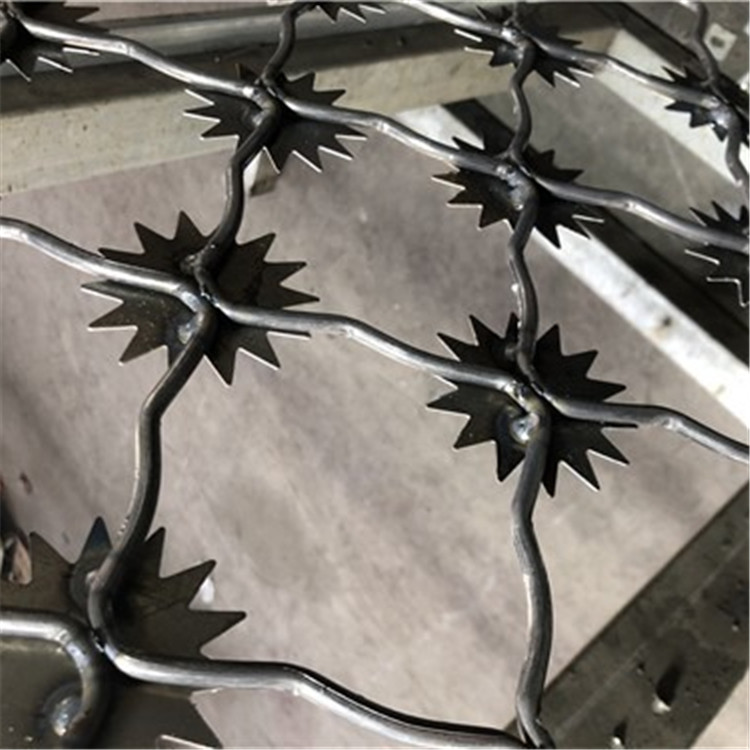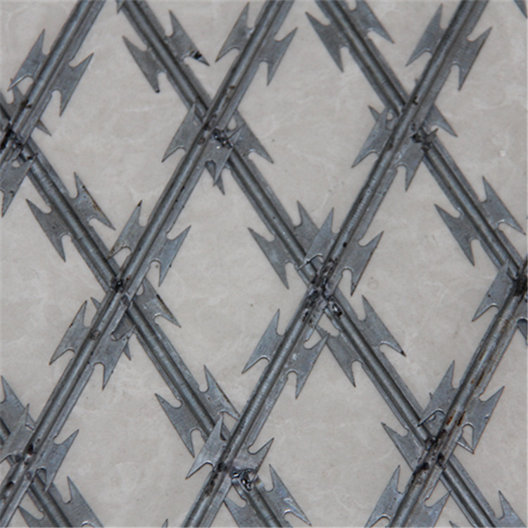 刀片刺繩監獄防護網刀片刺網材料有低碳鋼絲、冷扎熱鍍鋅金屬薄板,不銹鋼板材,不銹鋼線等:加工工藝:由熱鍍鋅鋼板或不銹鋼板金屬薄板沖壓模具出尖銳的刀塊狀,高支撐力鍍鋅鐵絲也許不銹鋼線做銅芯電纜組成的阻絕元器件。因為刀片刺繩造型相互不容易觸碰,因此能抵達很好的安全防護隔絕功效,還具備好看、經濟發展有效、防阻功效好、工程施工方便、長壽命等出色特點,包裝采用內防潮紙外蛇皮口袋,原材料采用Q235碳素鋼,網眼:50*100毫米、70*150mm等,絲距:3.8-6mm,管經:48mm*48mm、60mm*60mm*3mm等,非常規范型號規格可依據用戶需求訂制。