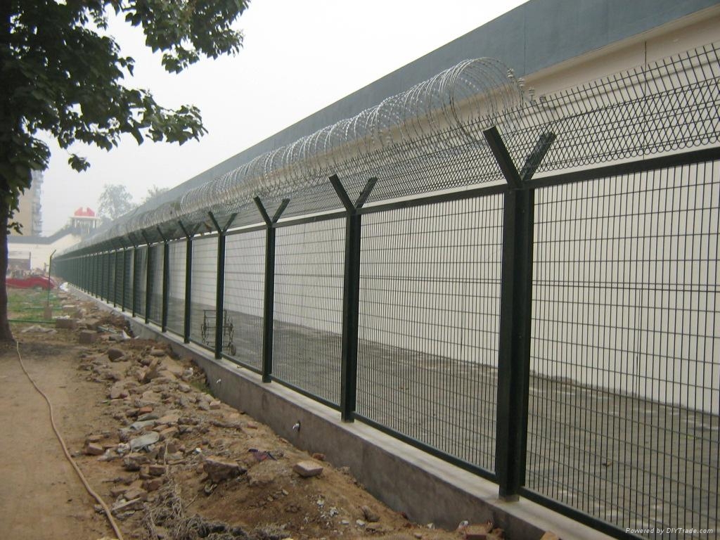 監獄外圍鋼網墻內墻鋼網墻圍墻鋼網墻-般頂端都設有V型支架與立柱焊接。材料通常選擇和立柱同等材料或者稍小規格材料搭