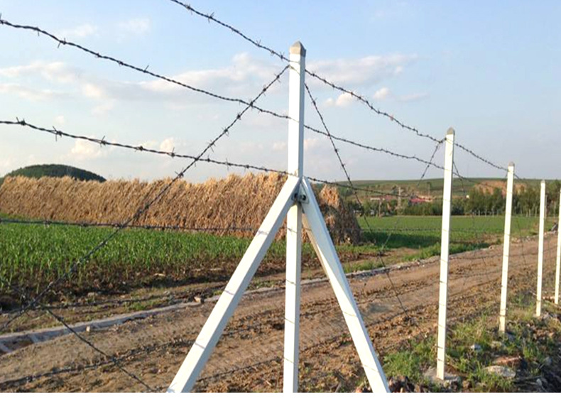 5、T字型邊境鐵絲網,"T型網樁刺鐵絲按側部14道橫絲,2道斜拉絲,頂部5道橫絲的標準架設,側培刺鐵絲間距15厘米,底部刺鐵絲距離地面距離為5厘米,頂部刺鐵絲間距為20厘米,相鄰兩個立樁之間斜拉刺鐵絲與水平刺鐵絲交叉處用專用卡扣固定,方型鋼樁刺鐵絲側部按14道橫絲, 2道斜拉絲,頂部3道橫絲的標準架設,側培刺鐵絲間距為15厘米,底部刺鐵絲距離地面距離為5厘米,頂部刺鐵絲間距為12.4厘米,相鄰兩個立樁之間斜拉刺鐵絲與水平刺鐵絲交叉處用專用卡扣固定。